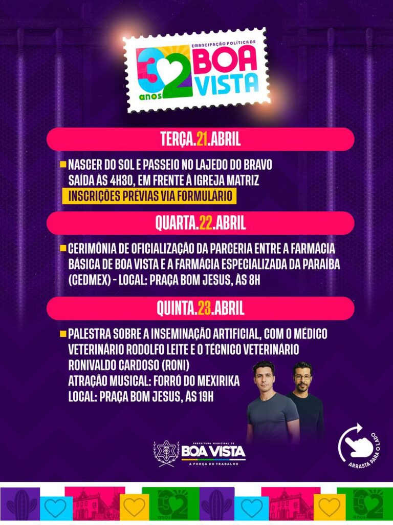 A Prefeitura Municipal de Boa Vista preparou uma programação ampla e diversificada para celebrar os 32 anos de emancipação política do município. As atividades acontecem entre os dias 21 e 30 de abril, reunindo ações institucionais, culturais, esportivas, religiosas e de prestação de serviços. Além de duas grandes inaugurações, assinatura de ordem de serviço e ações institucionais, haverá grandes shows em praça pública no dia 25 de abril.